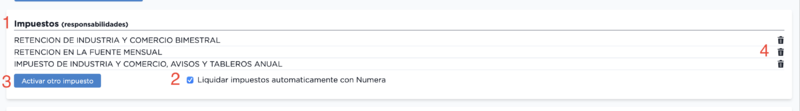 Para activar la liquidación automática de impuestos debe ir al módulo de empresas, y sobre la mitad de la página seleccionar la liquidación automática de impuestos. Si es necesario puede ajustar la periodicidad de los impuestos sugeridos por Numera: