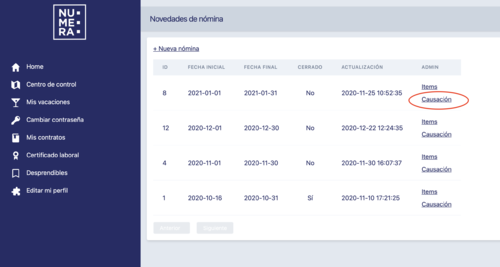 1. Diríjase a la nómina que desea causar dando click en centro de control / nóminas