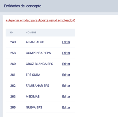 Filtre el tipo de aporte (por ejemplo salud, pensión) y en PUC Admin puede dar click en crear nueva entidad.