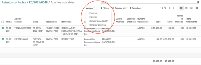 Seleccione las cuentas y sobre el botón “Acción” elijar “romper conciliación”. Esta acción deja los apuntes otra vez libres de para conciliación y, por tanto, la factura o asiento otra vez pendiente de pago.